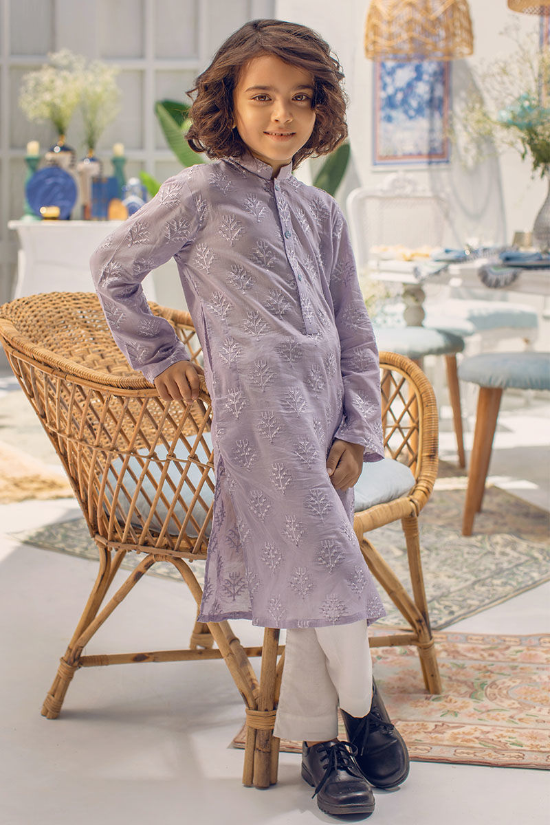 A chikankari inspired run on embroidery lawn kurta in a soft periwinkle hue. Paired with plain white pants.