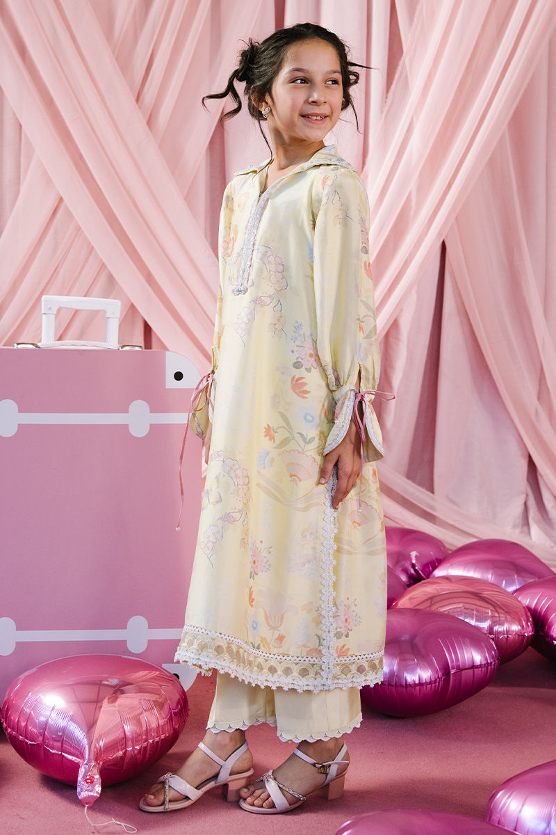 A seamless lemon-hued ensemble adorned with a delicate floral print, radiating freshness and effortless charm. The look is elevated with an embellished statement collar, intricately detailed with pearls and beads for a refined yet eye-catching finish. Designed with voluminous bishop sleeves featuring subtle slits, the silhouette feels graceful with a modern edge. Paired with a lemon izaar highlighted by contrasting details, this outfit is a perfect blend of softness, sophistication, and contemporary festivity.