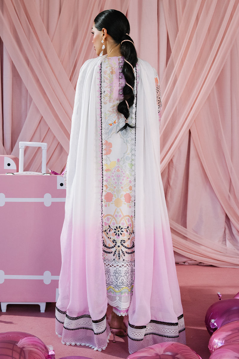 A fresh white ensemble featuring a composed print enriched with soft unicorn hues and striking black accents, creating a look that feels both modern and whimsical. The crew neckline is delicately adorned with pearl embellishments and finished with statement 3D pearl bow buttons, adding a refined yet playful touch. The sleeves stand out with oversized embellished bow cutwork at the hem. Paired with a crisp white izaar detailed with a pink color block, the look is completed with a white and pink ombré dupatta, elevated with organza inserts and delicate lace accents. A perfect balance of elegance, charm, and contemporary festivity.