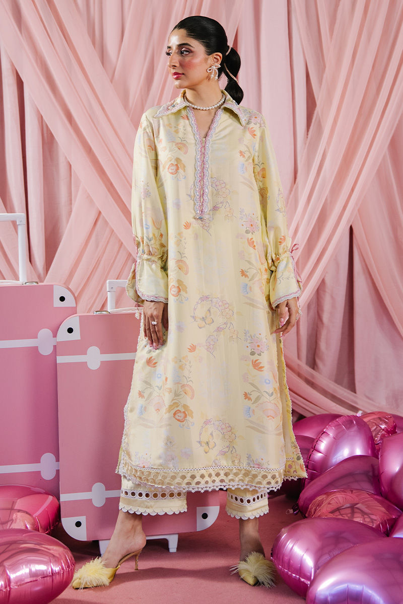 A seamless lemon-hued ensemble adorned with a delicate floral print, radiating freshness and effortless charm. The look is elevated with an embellished statement collar, intricately detailed with pearls and beads for a refined yet eye-catching finish. Designed with voluminous bishop sleeves featuring subtle slits, the silhouette feels graceful with a modern edge. Paired with a lemon izaar highlighted by contrasting details, this outfit is a perfect blend of softness, sophistication, and contemporary festivity.