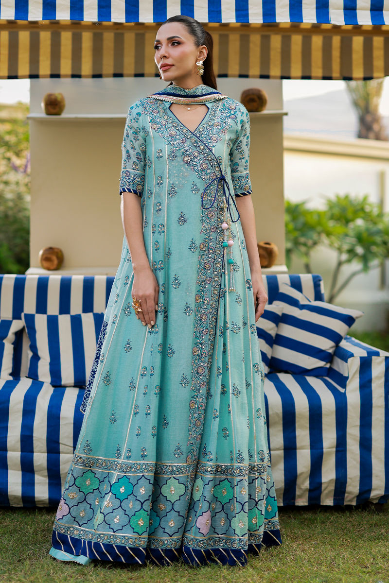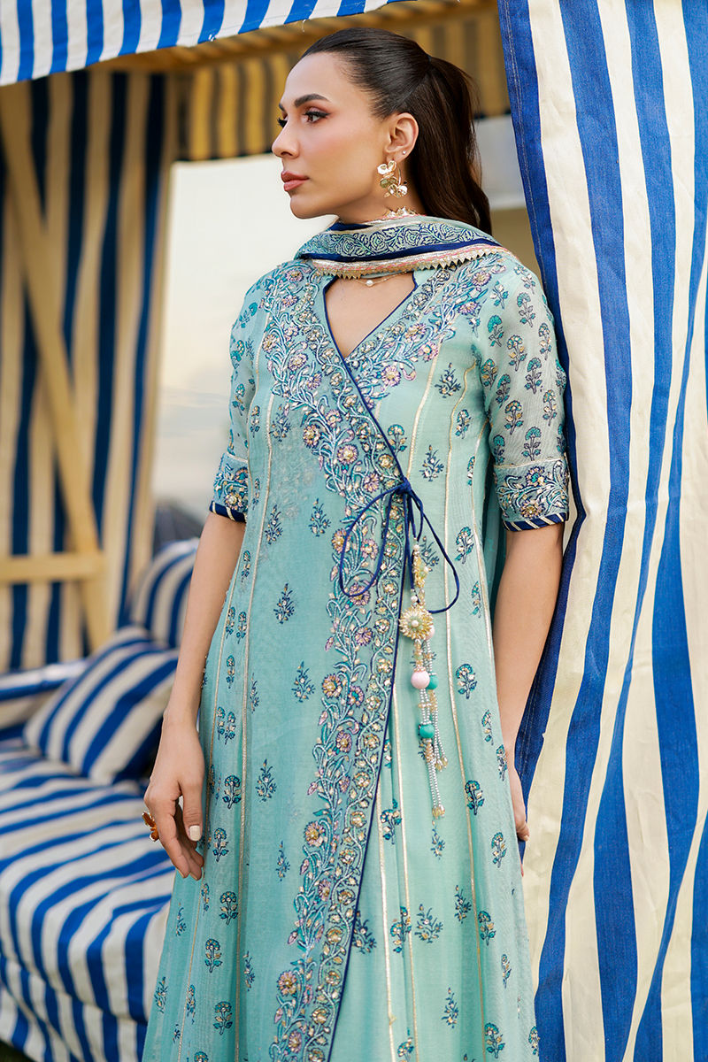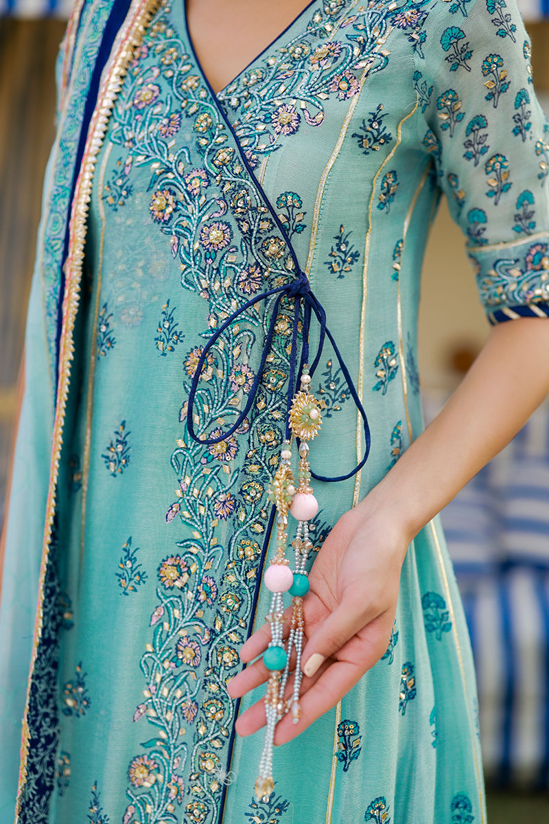 An ice blue angharka crafted in khaddi net, featuring block print and tassel detailing, with hand-embellished gota accents. Paired with an izaar and a medium silk dupatta adorned with block print and gota detailing for a graceful and elegant ensemble.