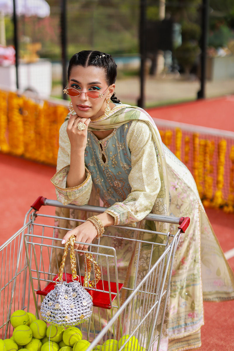 An elegant cream raw silk kameez, delicately adorned with zardozi handwork and refined gota detailing for a touch of timeless charm. Paired with a tailored Korean silk izaar and a flowing medium silk printed dupatta, this ensemble blends classic craftsmanship with graceful sophistication.