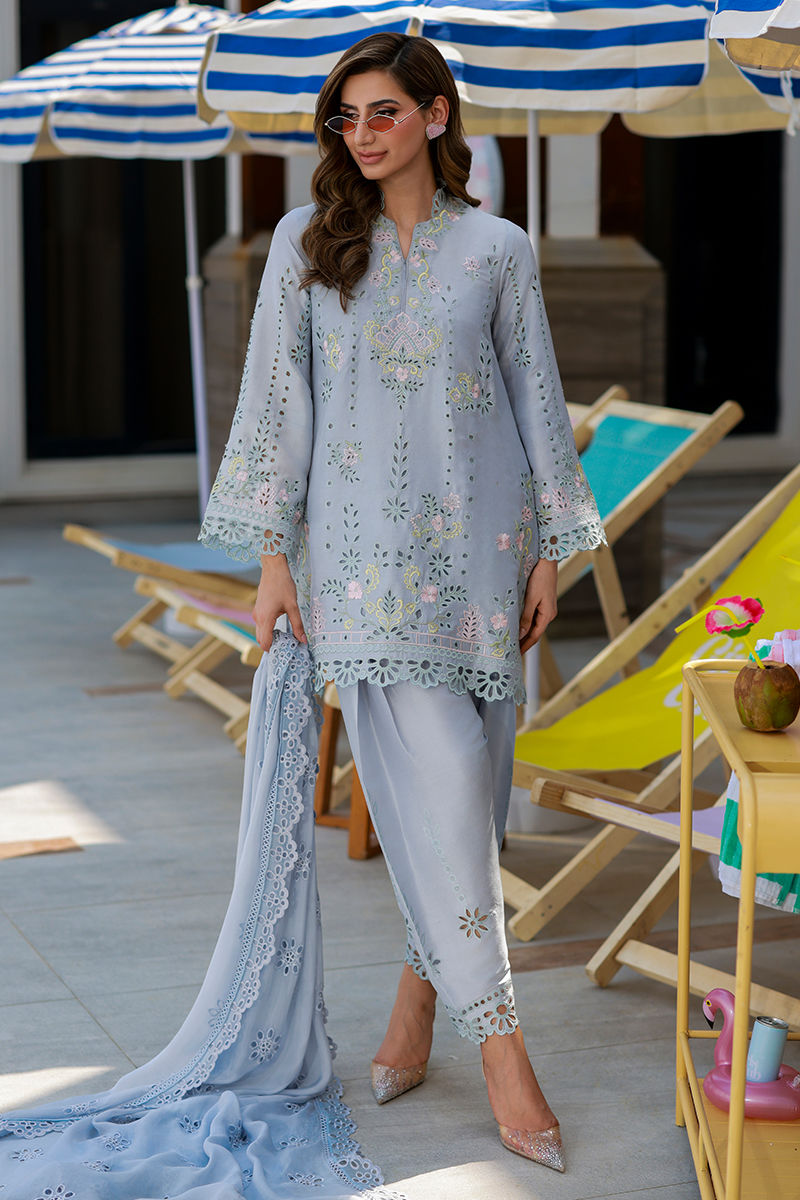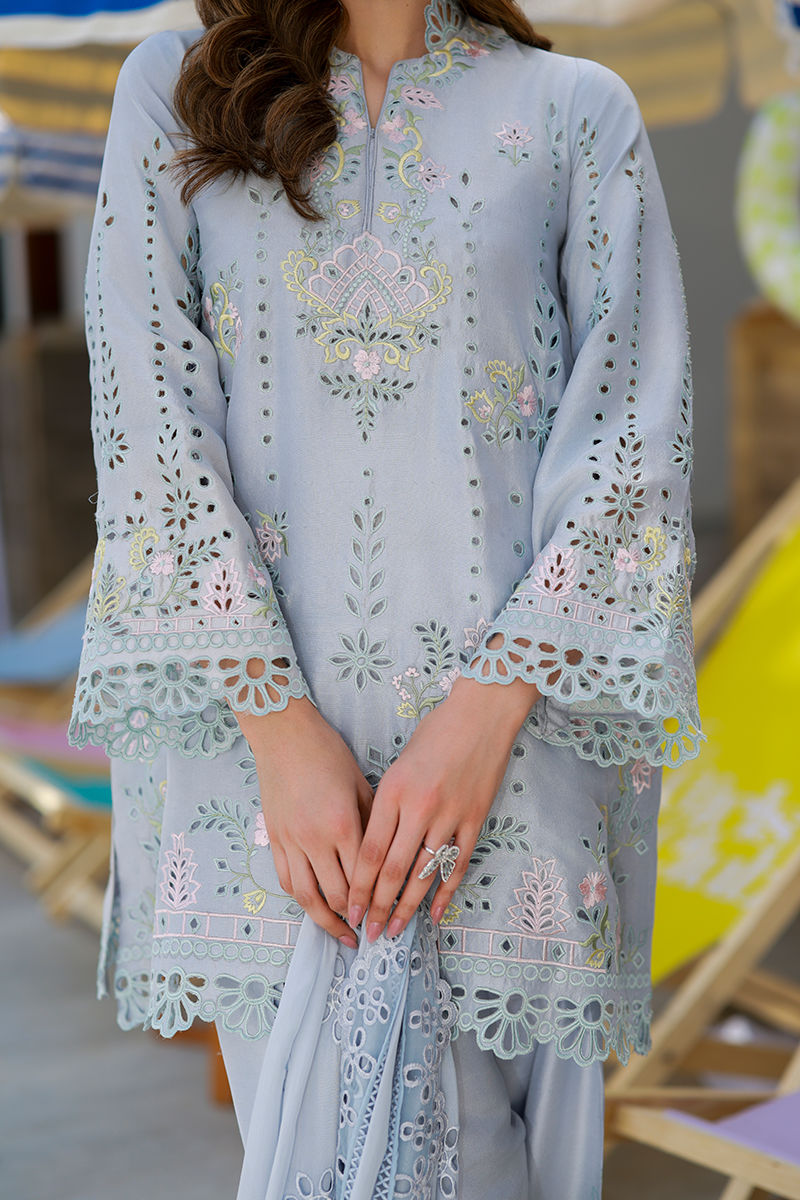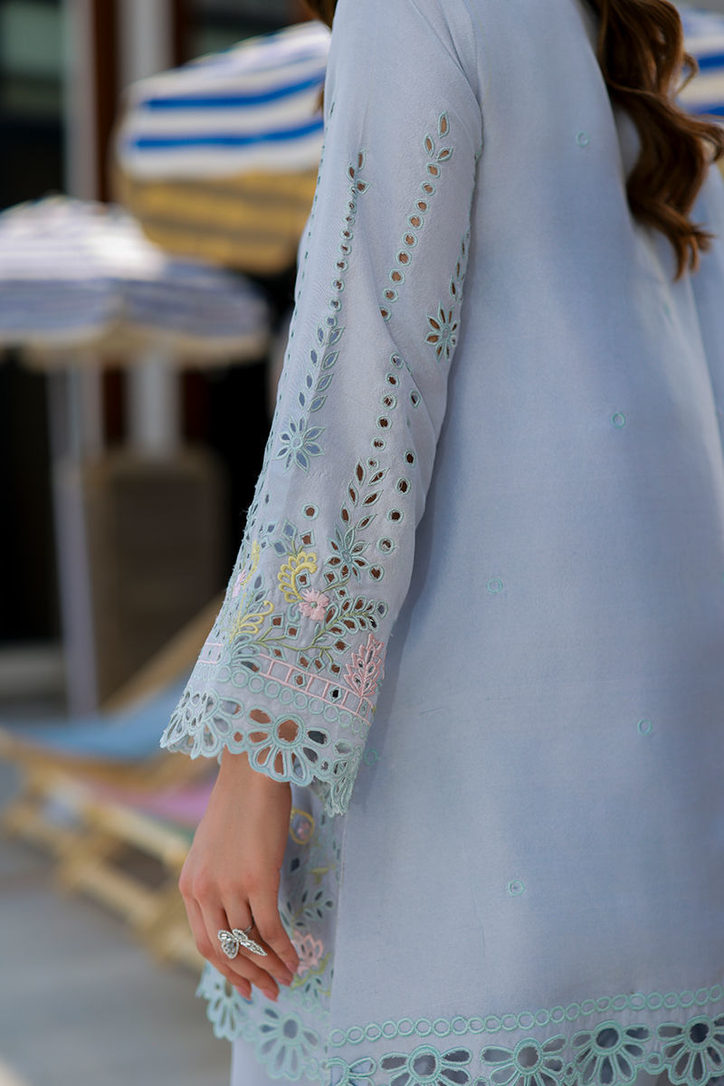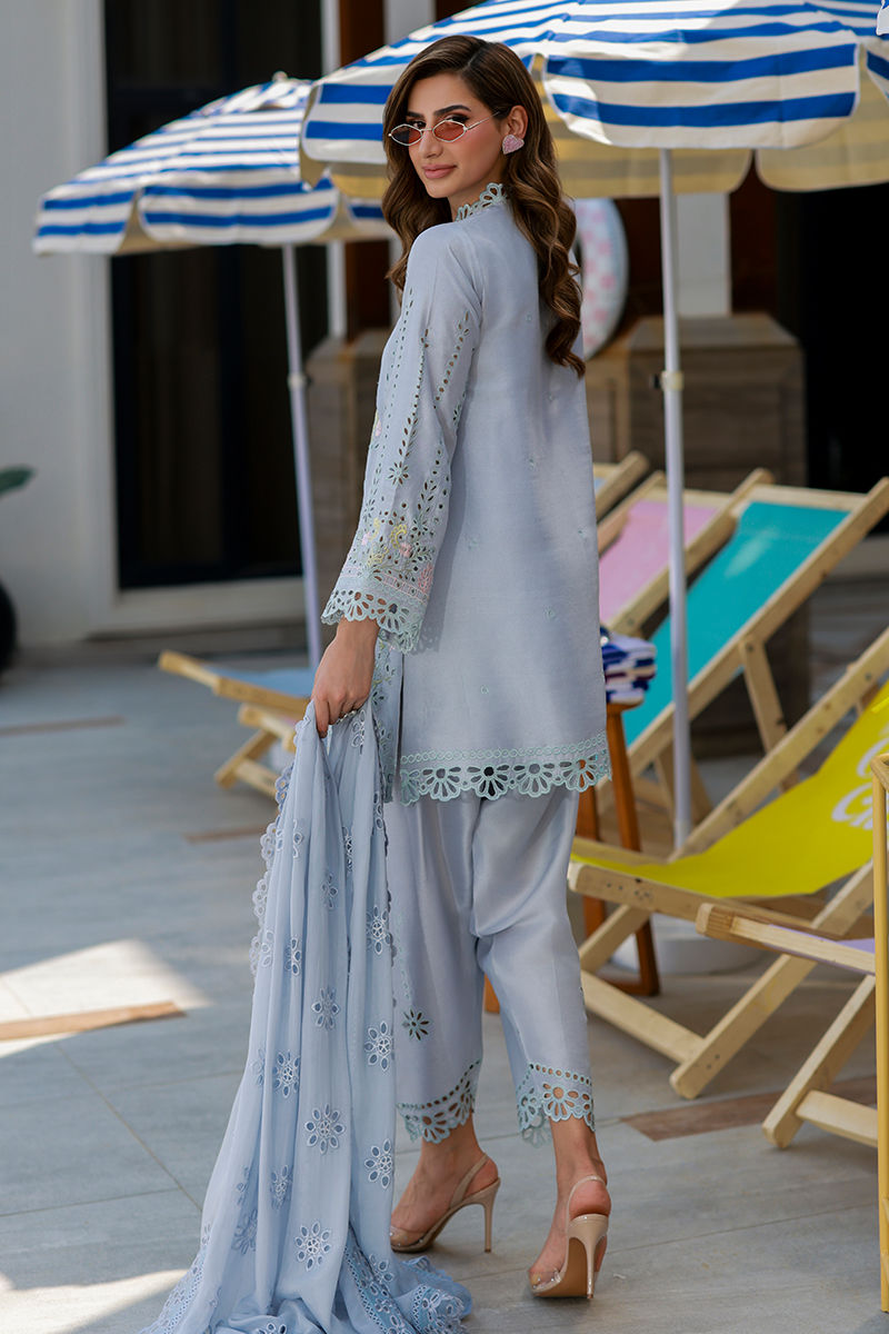 A periwinkle raw silk short shirt paired with a shalwar, adorned with delicate pastel resham embroidery and intricate cutwork across the sleeves and daaman. The raw silk narrow shalwar feature matching cutwork detailing, complemented by a schiffli silk dupatta finished with cutwork along all four borders.