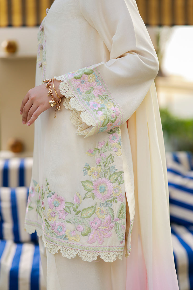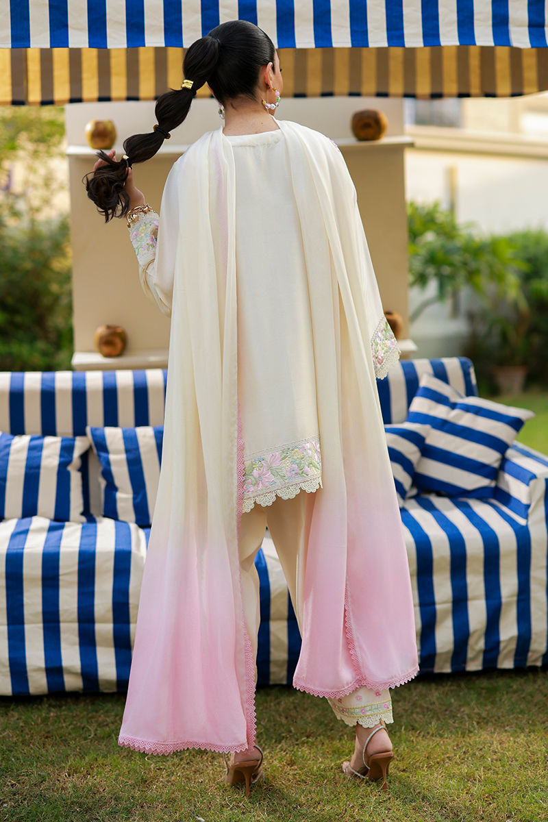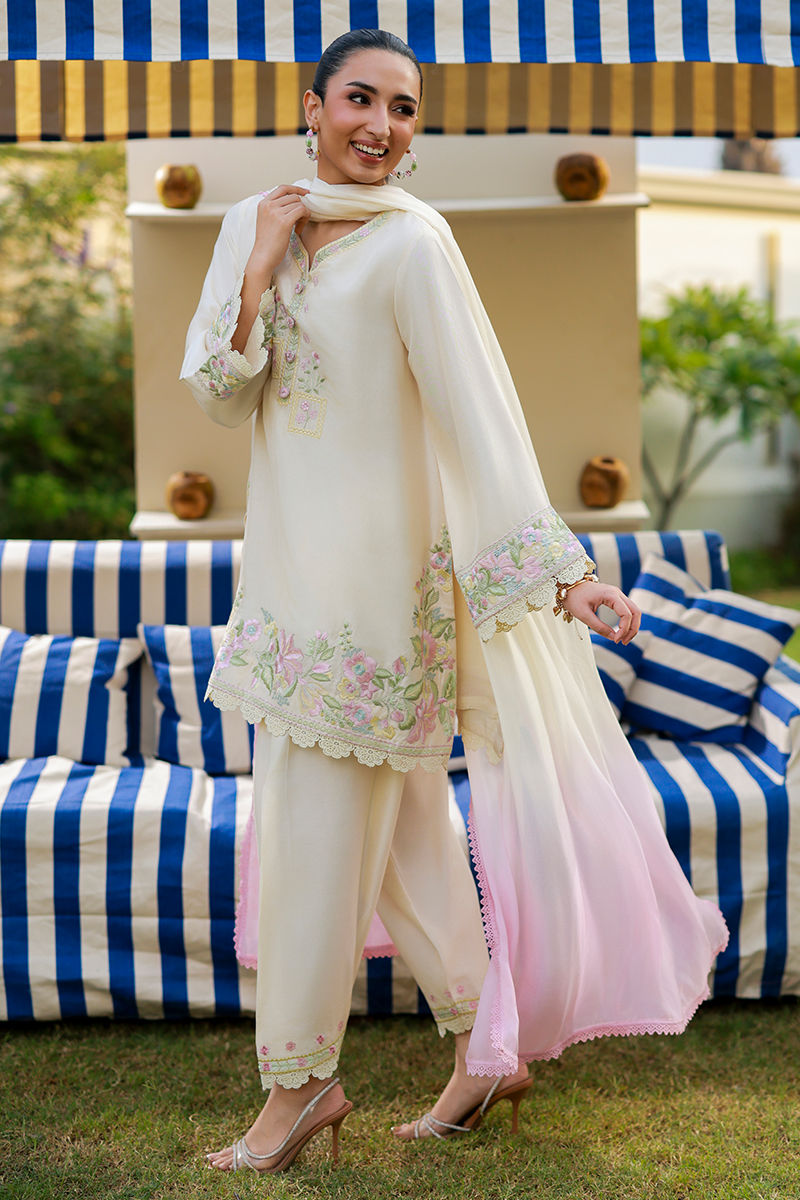 A butter yellow raw silk short shirt paired with a narrow shalwar featuring 3D buttons, finished with an ombré medium silk dupatta for a bright and elegant look.