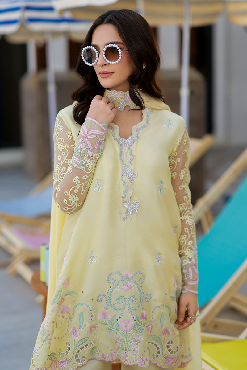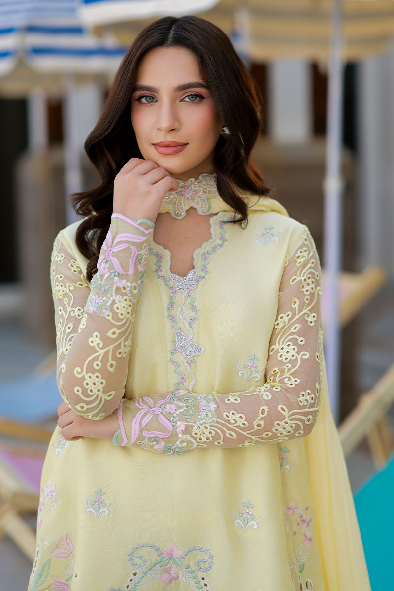 A butter-yellow raw silk short shirt paired with a matching shalwar, delicately adorned with pastel resham embroidery combined with schiffli detailing and butterfly embellishments along the neckline. The organza cutwork sleeves are further enhanced with fine resham embroidery. Finished with a Scandinavian-inspired dupatta, styled with an embellished brooch and butterfly tassels cascading from both sides of the pallu—creating a fun, youthful, and visually pleasing Eid look.