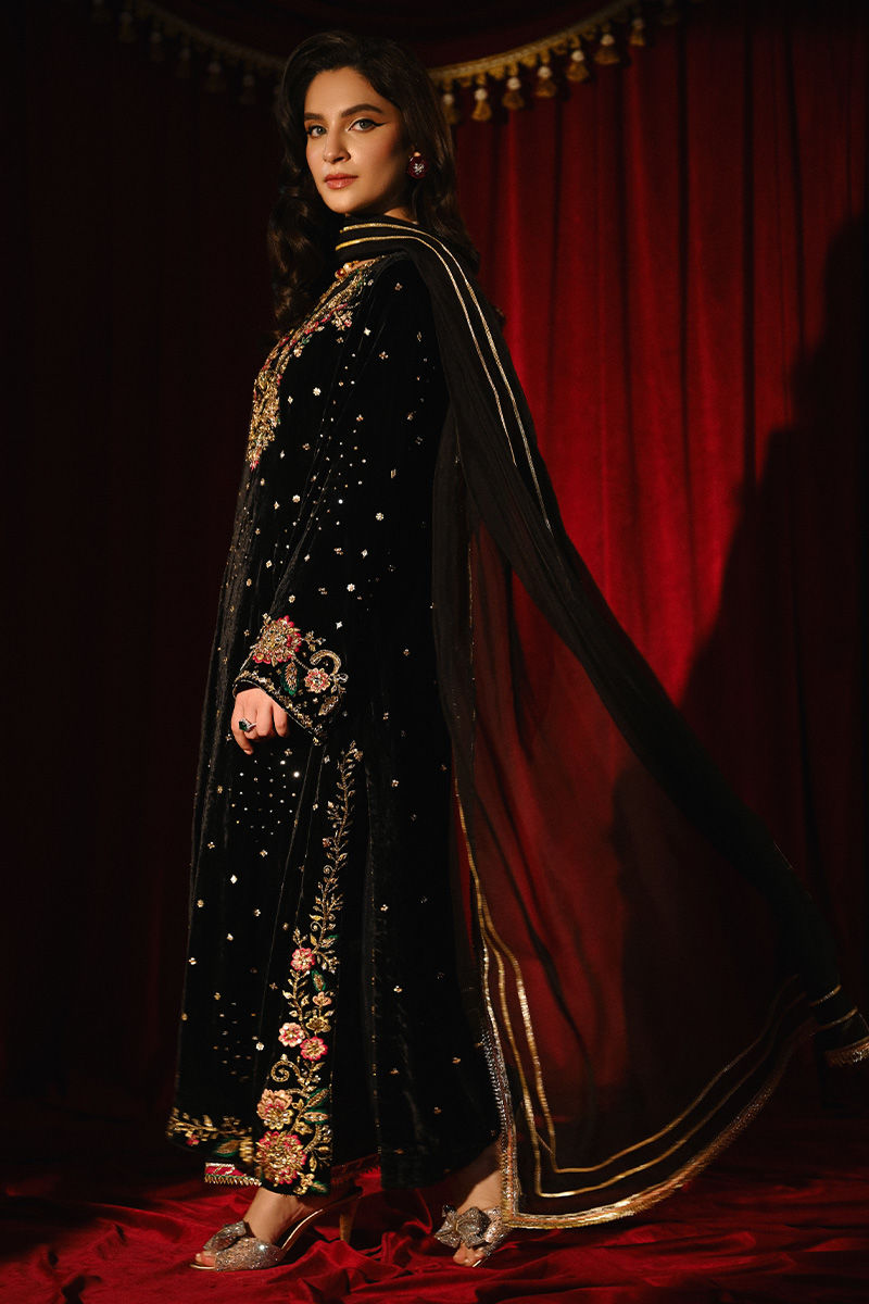 This luxurious black velvet ensemble is adorned with intricate colored resham and zardozi handwork, complemented by a delicate gold sequin spray that adds a soft, luminous sheen. Paired with a block-printed izaar and dupatta, the look beautifully combines rich craftsmanship with timeless elegance.
