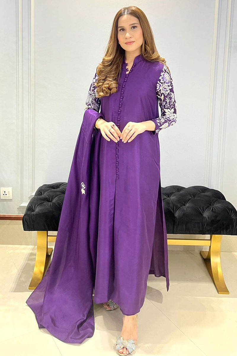 This deep purple classic sherwani-style shirt exudes elegance, featuring exquisite gara embroidery on the sleeves. The shirt is paired with straight raw silk pants and comes with a medium silk dupatta, creating a regal and sophisticated ensemble.