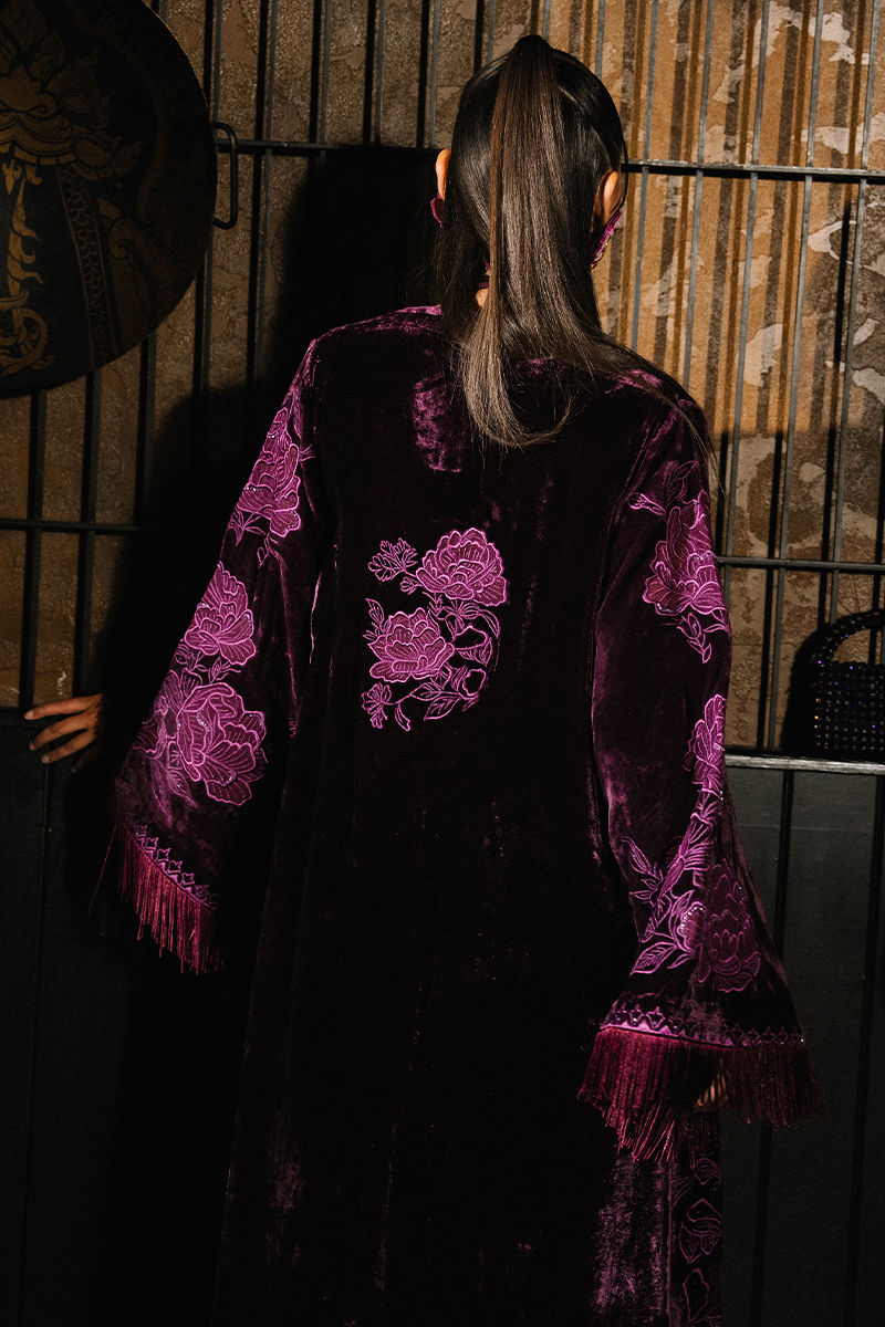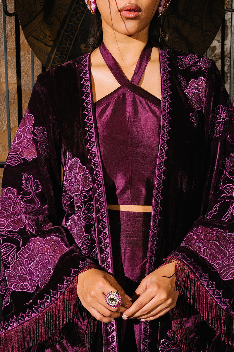A long plum kimono jacket featuring dramatic, ultra-flared sleeves embellished with oversized organza appliqué and intricate embroidery. The sleeves are elevated with delicate fringe detailing and subtle handwork touches, adding movement and richness to the silhouette. Paired with a halter crisscross bandeau and flared sheesha silk pants, this ensemble blends statement artistry with modern elegance—bold, fluid, and unmistakably striking.