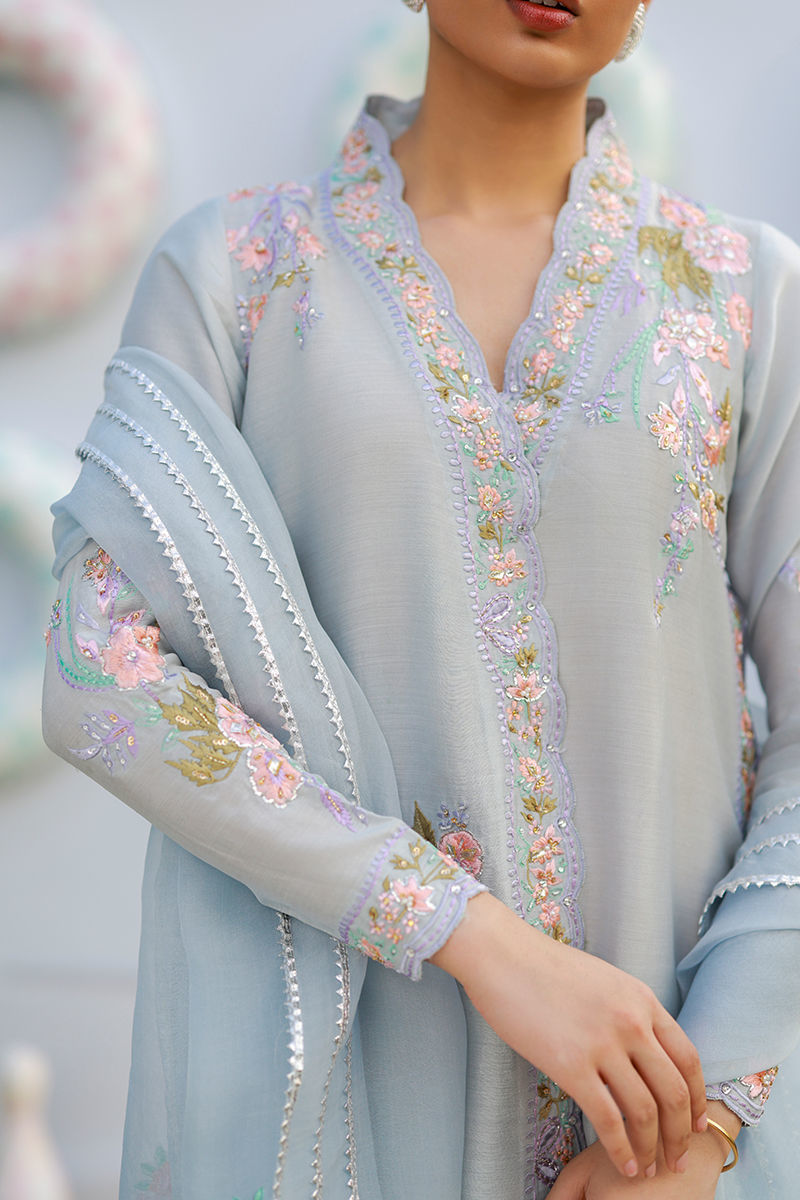 A periwinkle khaddi silk shirt with fitted sleeves and a scalloped neckline, adorned with floral embroidery in coral, lilac, and sage. Paired with dhaka pants featuring lace detailing, and completed with an organza dupatta with floral motifs and lace for a graceful, refined look.