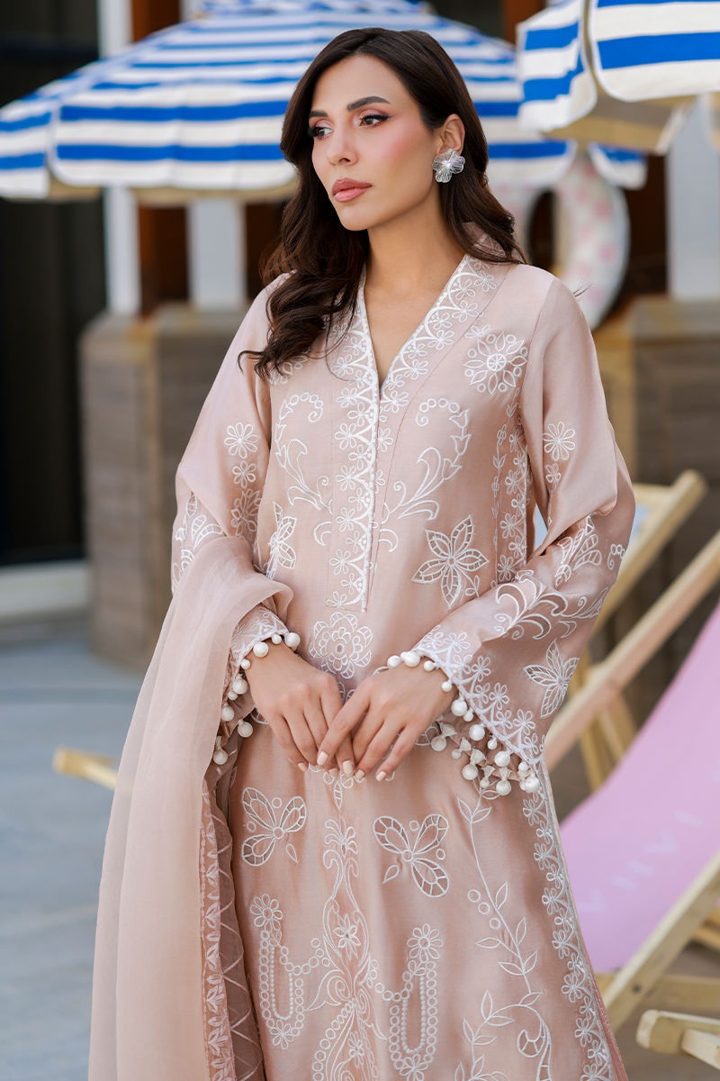 A long nude-toned kurta in Sheesha silk adorned with off-white resham embroidery and delicate Schiffli cutwork, paired with a crushed silk Izaar and complemented by an embroidered organza dupatta.