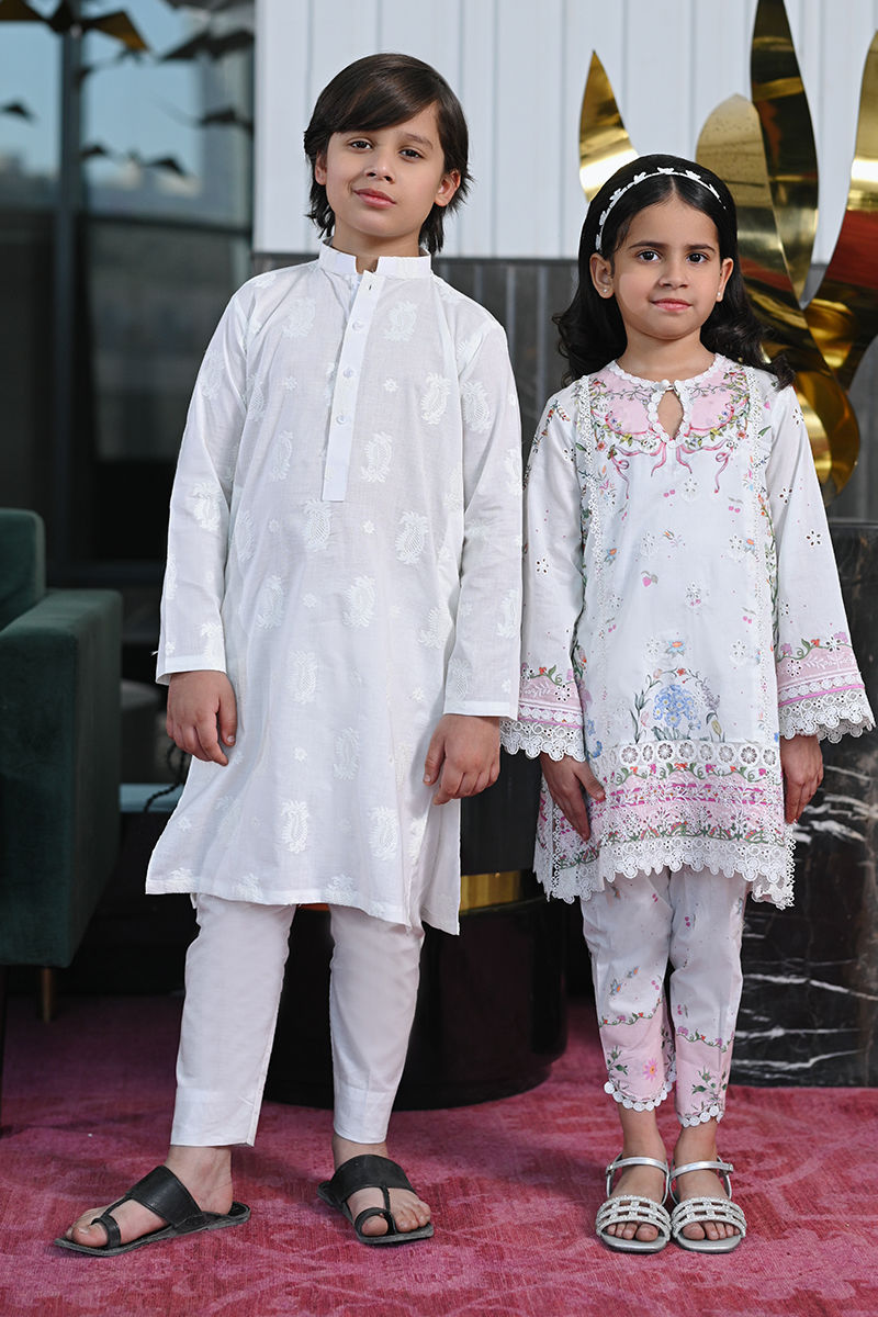 A refined white printed short shirt, subtly accented with hints of green and pink, and adorned with delicate lace detailing and borders. Paired with a beautifully printed shalwar. This ensemble embodies grace and sophistication, perfect for those who seek elegance in every detail.