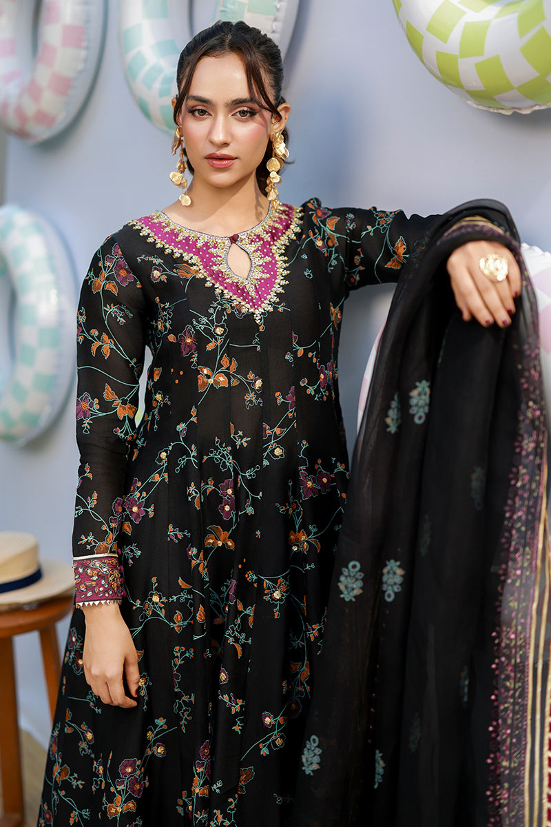 A black khaddi silk kalidar with a keyhole neckline and fitted sleeves, adorned with intricate screen print, lace, and gota accents. The hand-embellished neckline adds a touch of artisanal charm, paired with crushed dhaka featuring delicate lace detailing and a block-printed organza dupatta, creating a refined and sophisticated ensemble.
