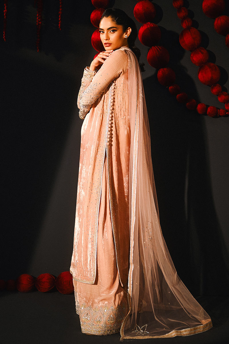 This powder pink velvet ensemble radiates timeless elegance with its embellished keyhole neckline, fitted embellished sleeves, and loop button details along the side vent. The back features organza panels with intricate embellishments, adding a graceful twist. Paired with embellished velvet Dhaka pants and a net dupatta adorned with Swarovski stone flower details, this look beautifully blends luxury, femininity, and modern charm.