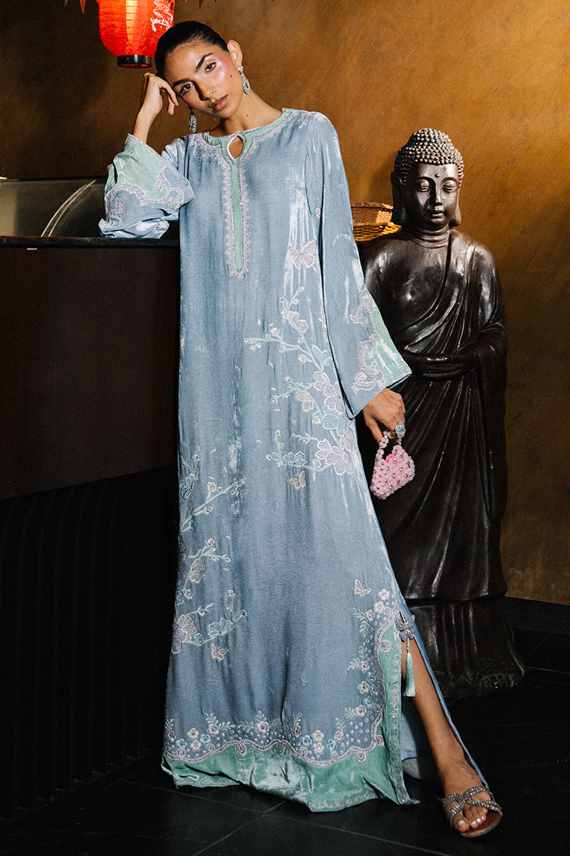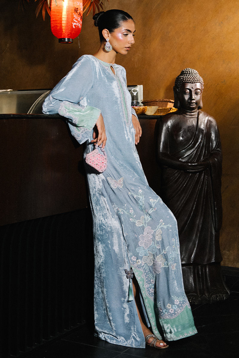 A flowing kaftan silhouette brought to life with delicate pastel Sakura motif embroidery, enhanced with hand-touched crystal stone detailing for a soft, ethereal sparkle. The design features elegant sage green color-blocking that adds a modern contrast, while embellished butterfly tassels adorning the slits lend a whimsical, graceful charm. An effortlessly chic statement piece perfect for refined festive or resort wear.