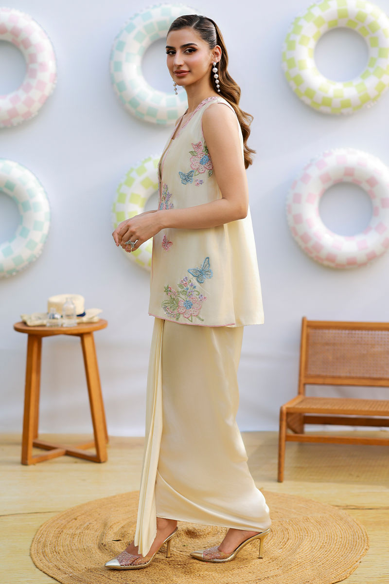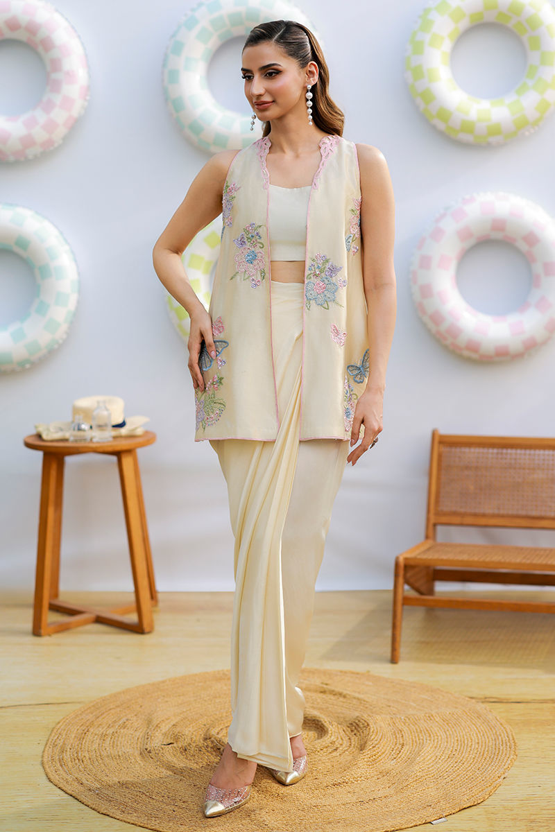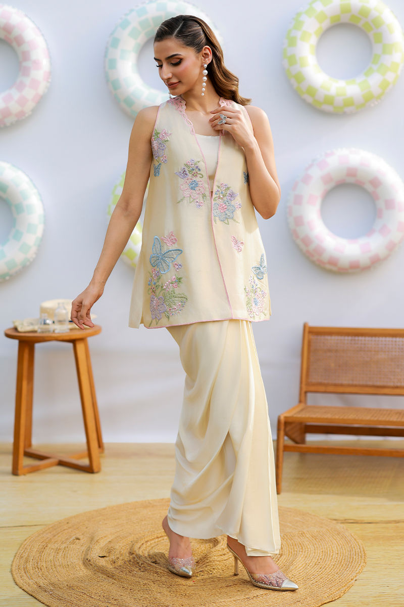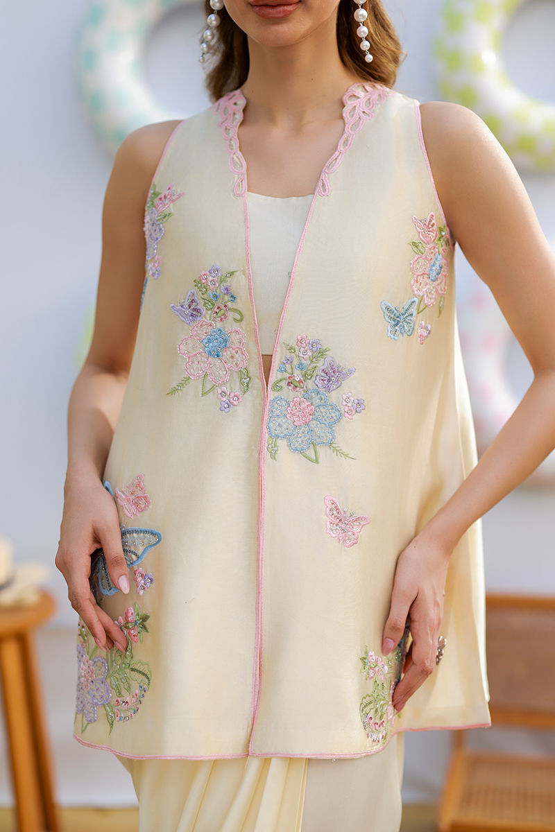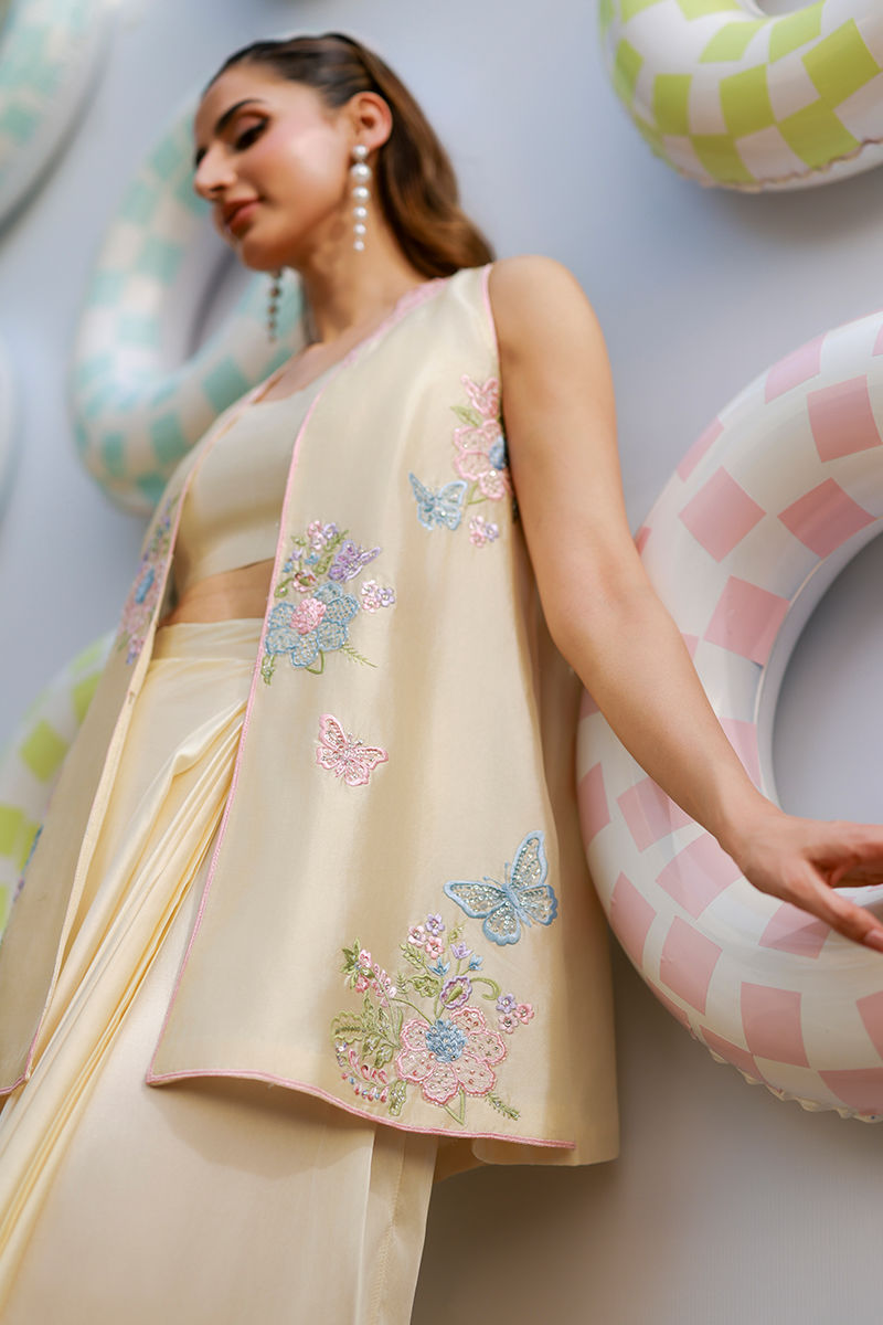 A butter yellow short jacket in sheesha silk paired with a pleated skirt, featuring pastel embroidery for an elegant and graceful look.