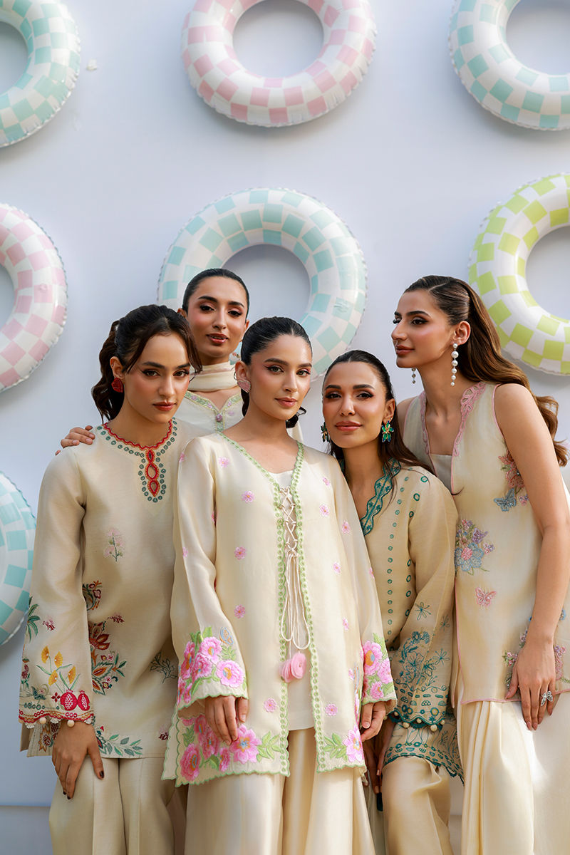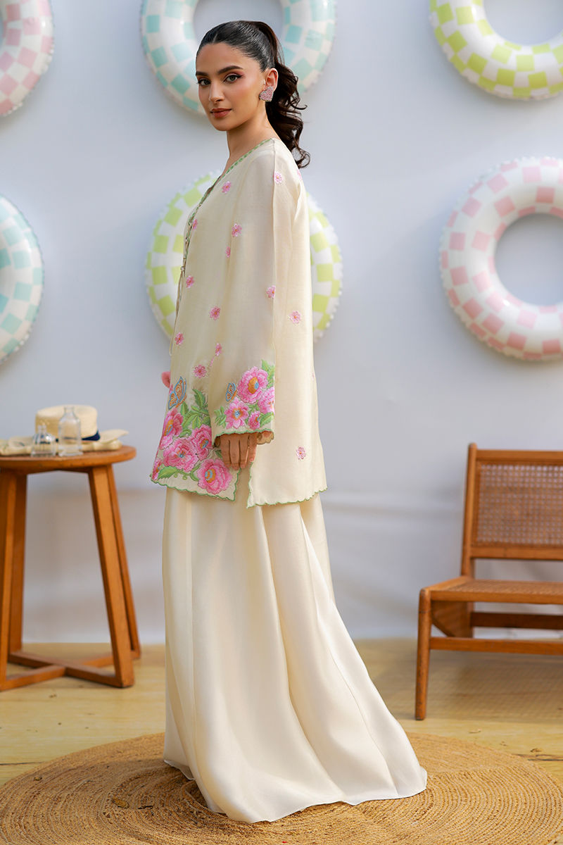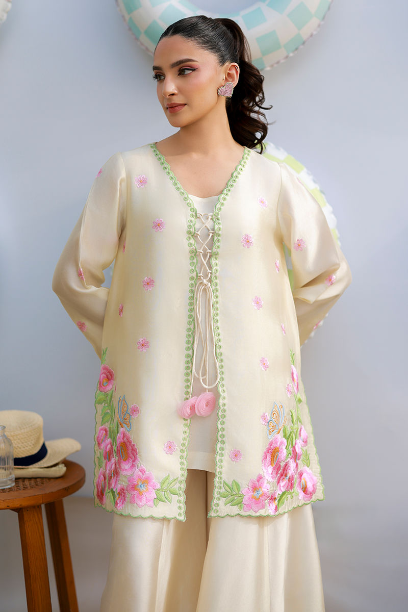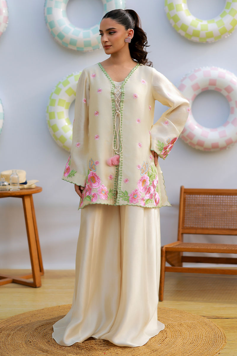A butter yellow sheesha silk short jacket paired with dhaka pants, featuring ghara embroidery and cutwork detailing for a stylish and elegant look.