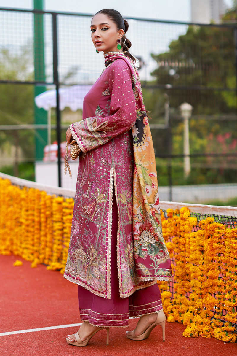 A striking magenta raw silk long A-line shirt featuring graceful bell sleeves with intricate cutwork and a round neckline highlighted by a delicate keyhole detail. The shirt is richly adorned with gota, moti, cutdana, pearl, and nakshi hand embellishments, blending traditional artistry with modern refinement. It is paired with a raw silk izaar, finished with printed borders and a shimmering gota ki bel, completing the ensemble with timeless elegance.