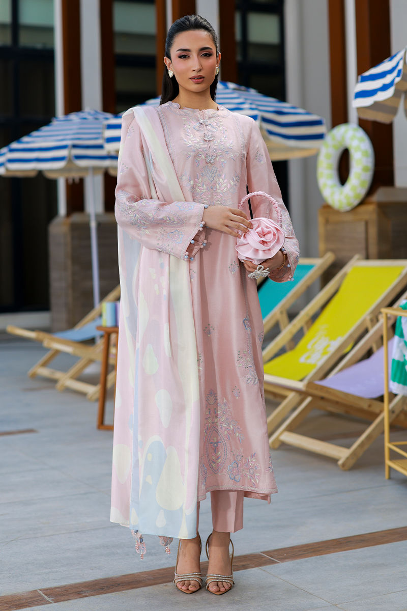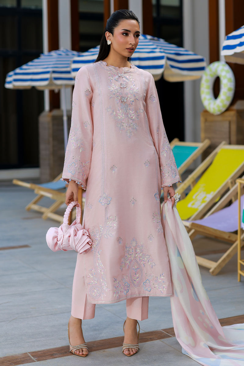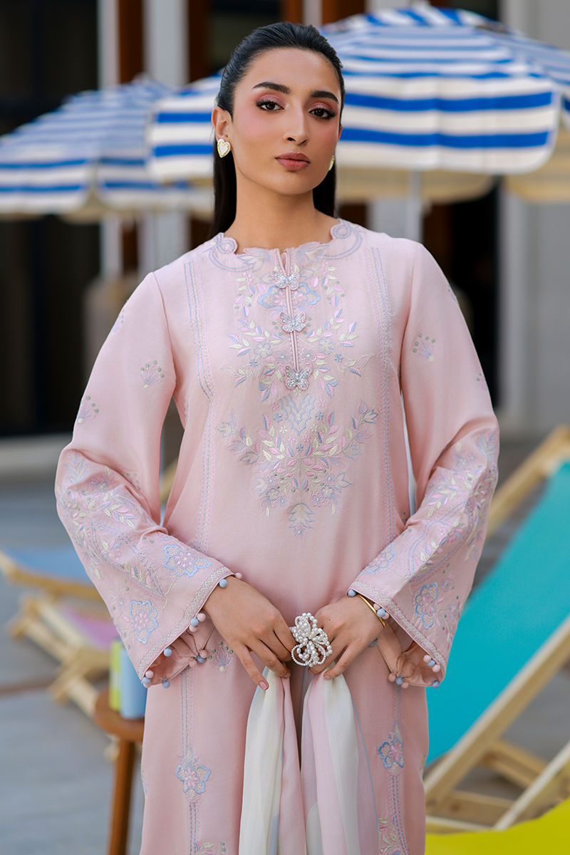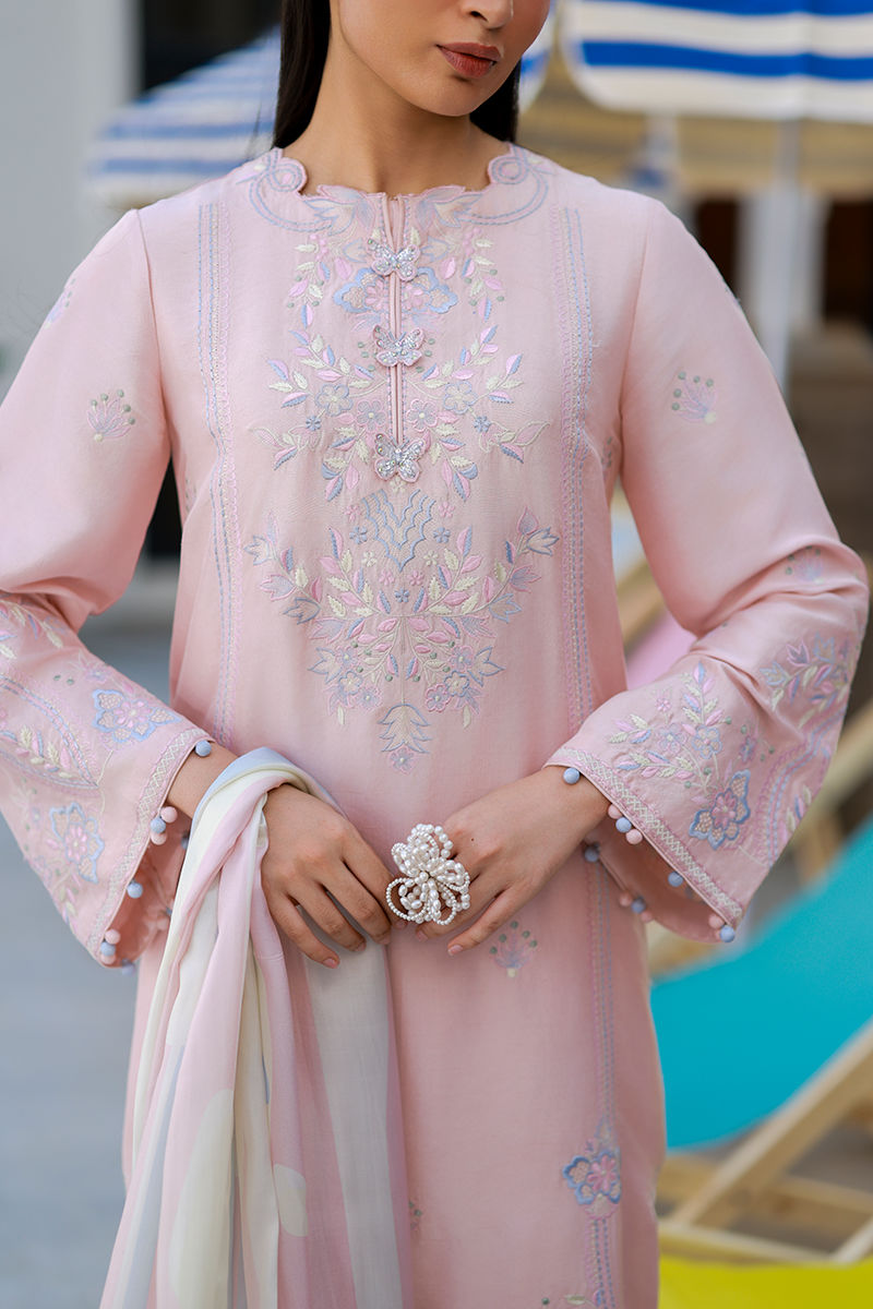 Pink raw silk long shirt with flowing bell sleeves, brought to life with delicate periwinkle, ivory, and pink embroidery. The cutwork neckline, adorned with whimsical butterfly buttons, adds a touch of artisanal charm. Styled with raw silk straight pants and a printed medium silk dupatta, this ensemble effortlessly balances modern elegance with poetic craftsmanship.